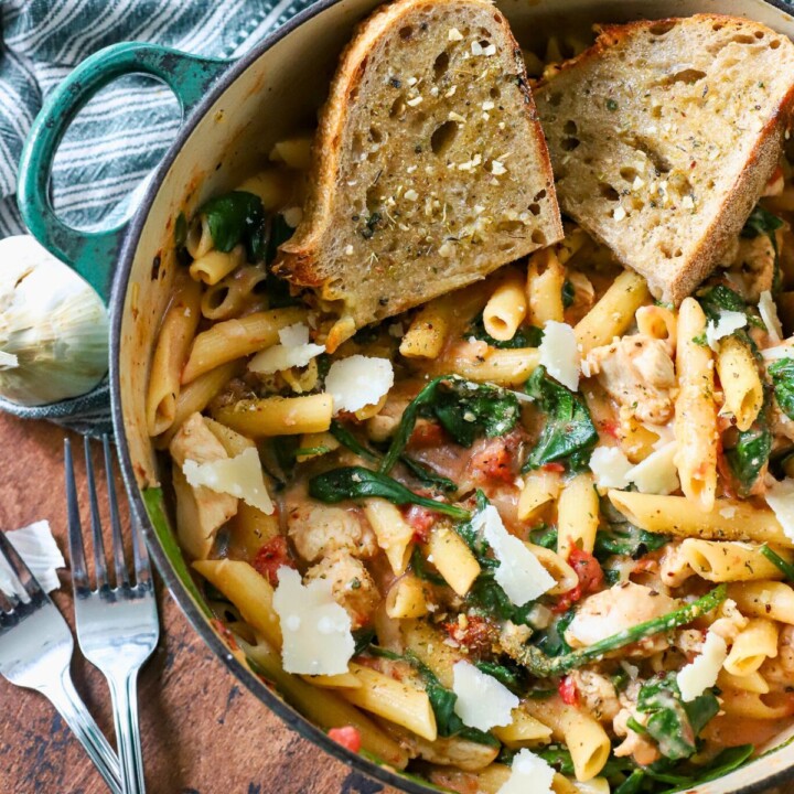 This 30-minute Creamy One Pan Chicken Spinach Pasta recipe is a quick and easy weeknight dish featuring succulent chicken, fresh spinach, tomatoes, and pasta in a cheesy cream sauce. It’s all cooked in a single pan for minimal cleanup!