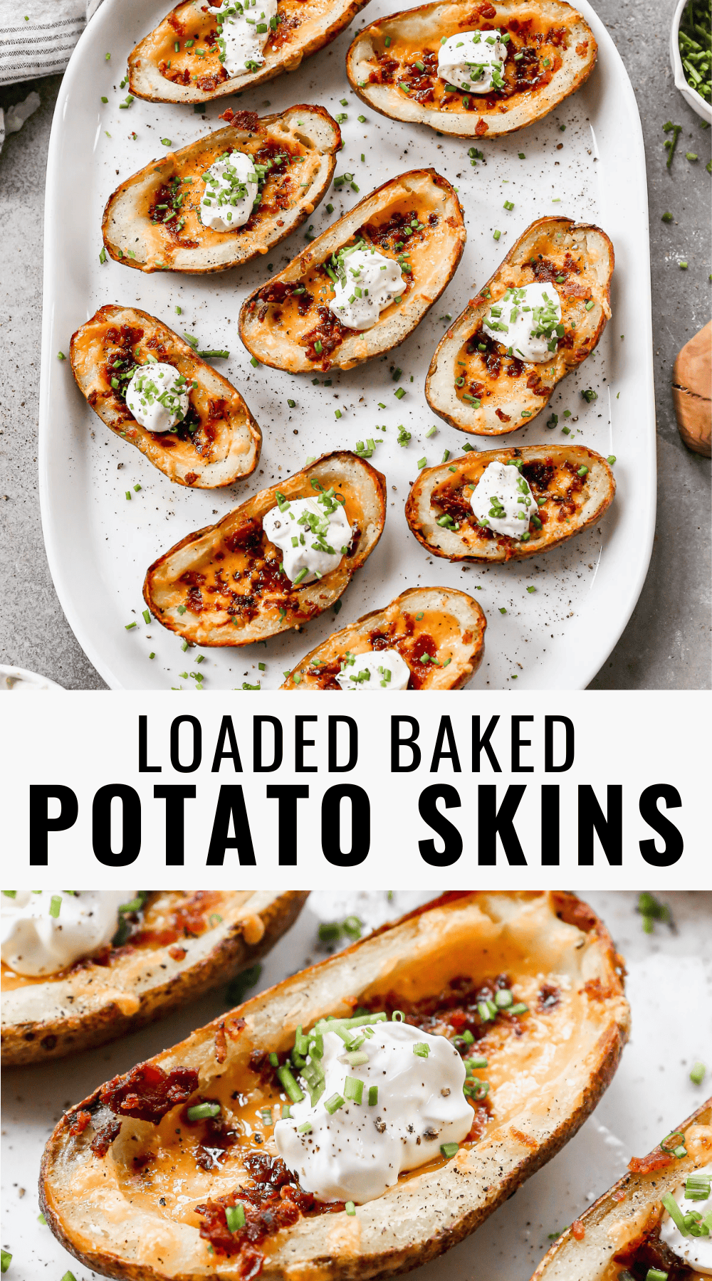 These Loaded Potato Skins are the ultimate appetizer: crispy potato shells filled with bacon, melted cheddar, sour cream, and chives. So easy, so irresistible!