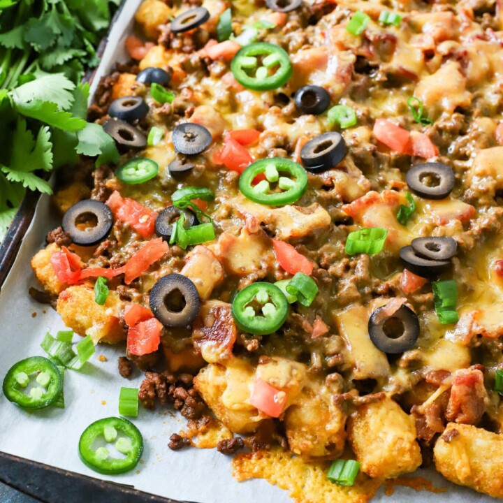 Enjoy the ultimate appetizer or dinner idea—Loaded Tater Tot Nachos! This irresistible 30-minute recipe with crispy tots, melted cheese, ground beef, and bacon will have you coming back for seconds and thirds!