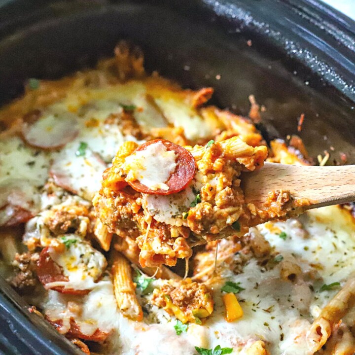 This cheesy Crockpot Pizza Casserole is an easy dinner the whole family will love! It's great for potlucks or leftovers!