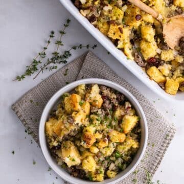 This version is especially delicious because it includes sausage, apples, and cranberries. Those mix-ins bring a warm, familiar fall flavor. The sweetness from the apples and dried cranberries rounds out the savory sausage. The combination feels both traditional and elevated. Everything you want in a holiday side!