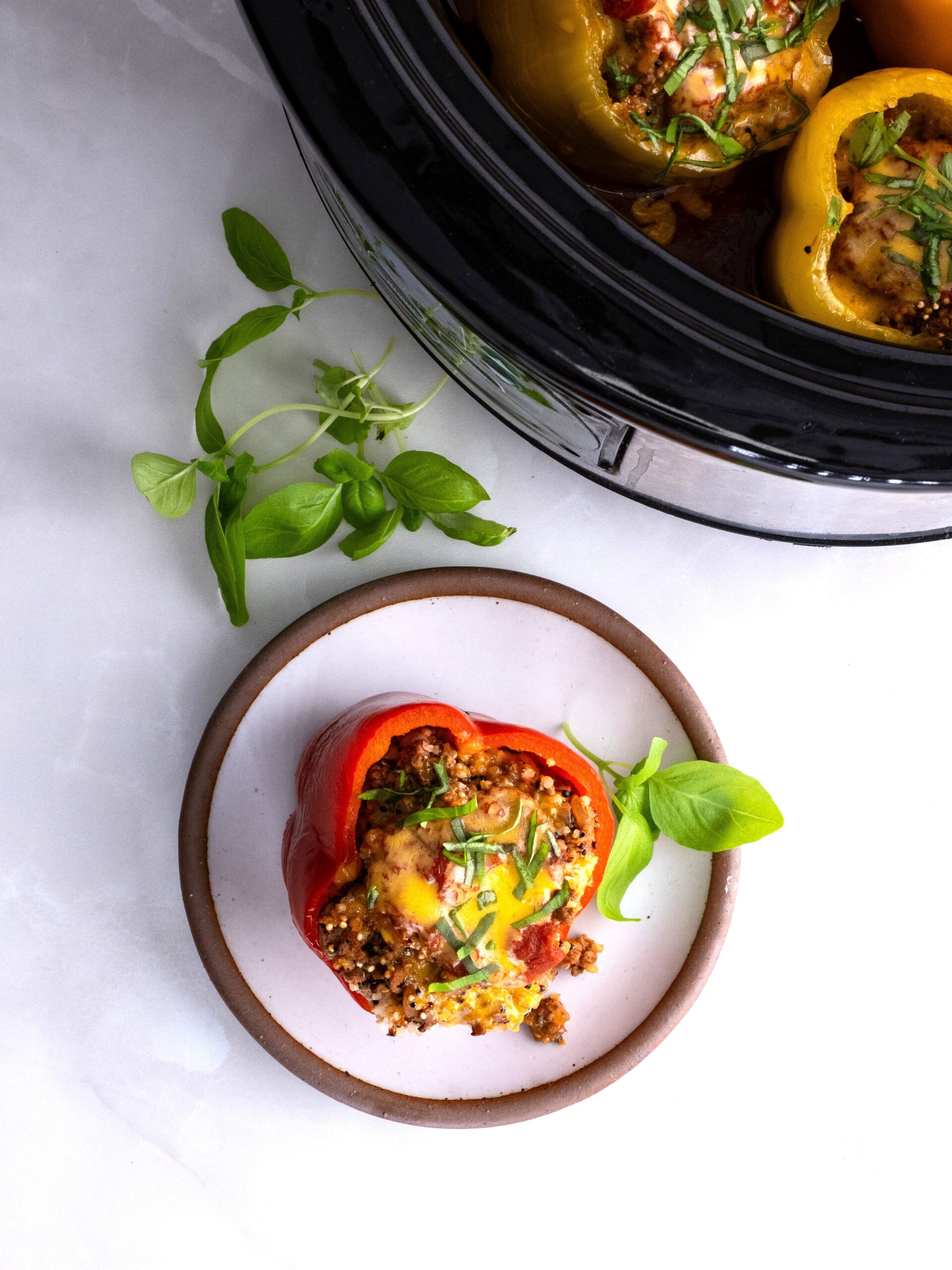 There are some days that cooking is a chore, even for someone like me who would rather be in the kitchen than anywhere else. For days like this, these Crock Pot Stuffed Peppers are the ideal dinner to prep. Not only are you bound to have leftovers, they’re hearty, packed with protein, flavor, and they also freeze beautifully. These Crock Pot Stuffed Peppers with beef, quinoa, and melty cheese are an easy, healthy dinner idea the whole family will love!