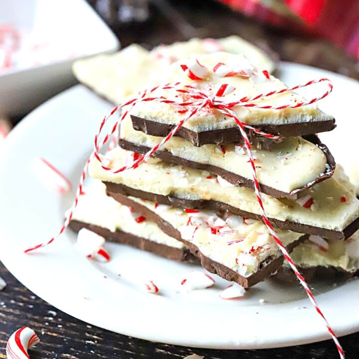 Dark and white chocolate with peppermint bits sprinkled on top. Yummy! So pretty, and great for gift giving.