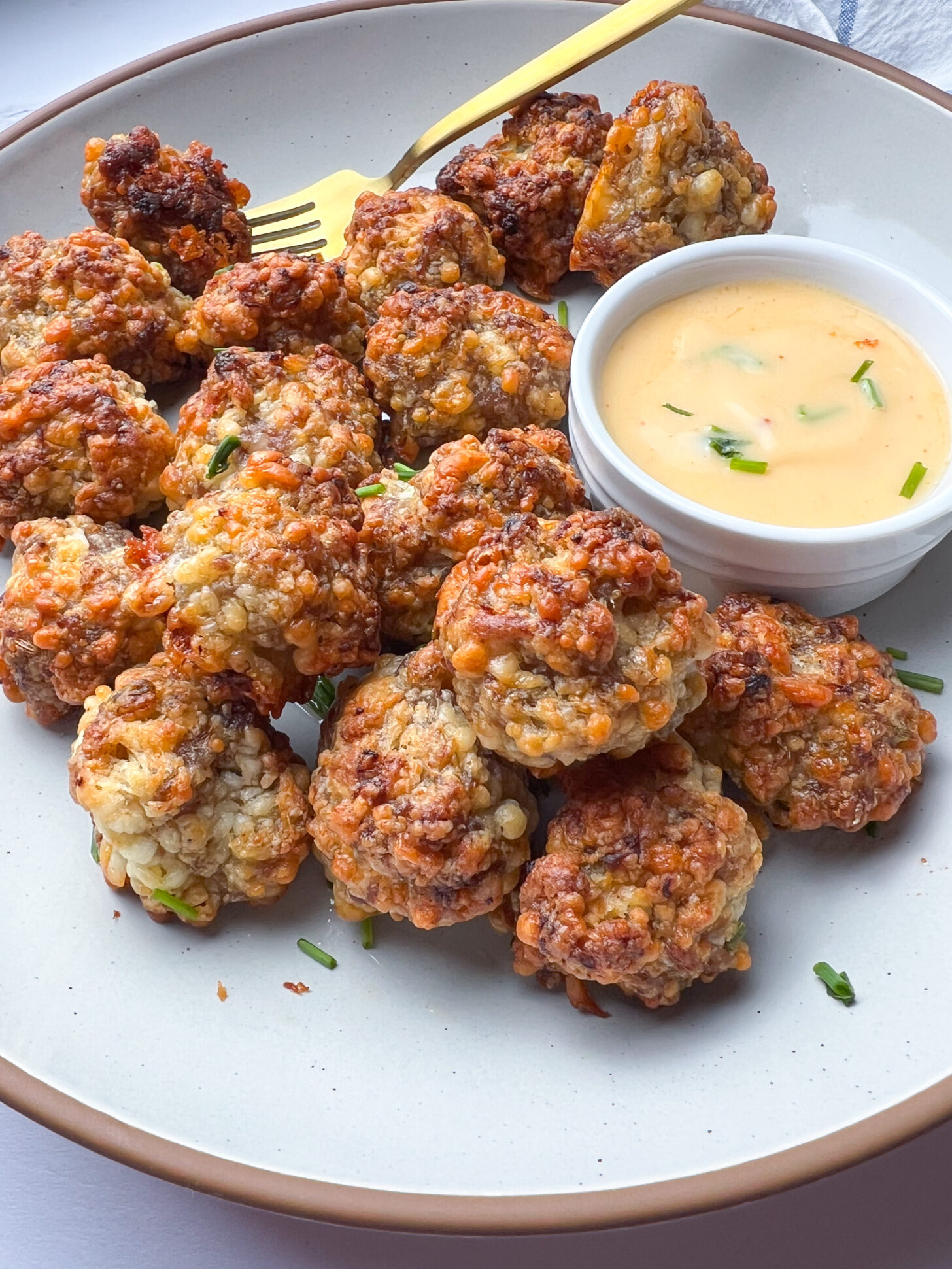 - Serve: Plate the sausage balls and garnish with more chives and serve with your favorite dipping sauces.