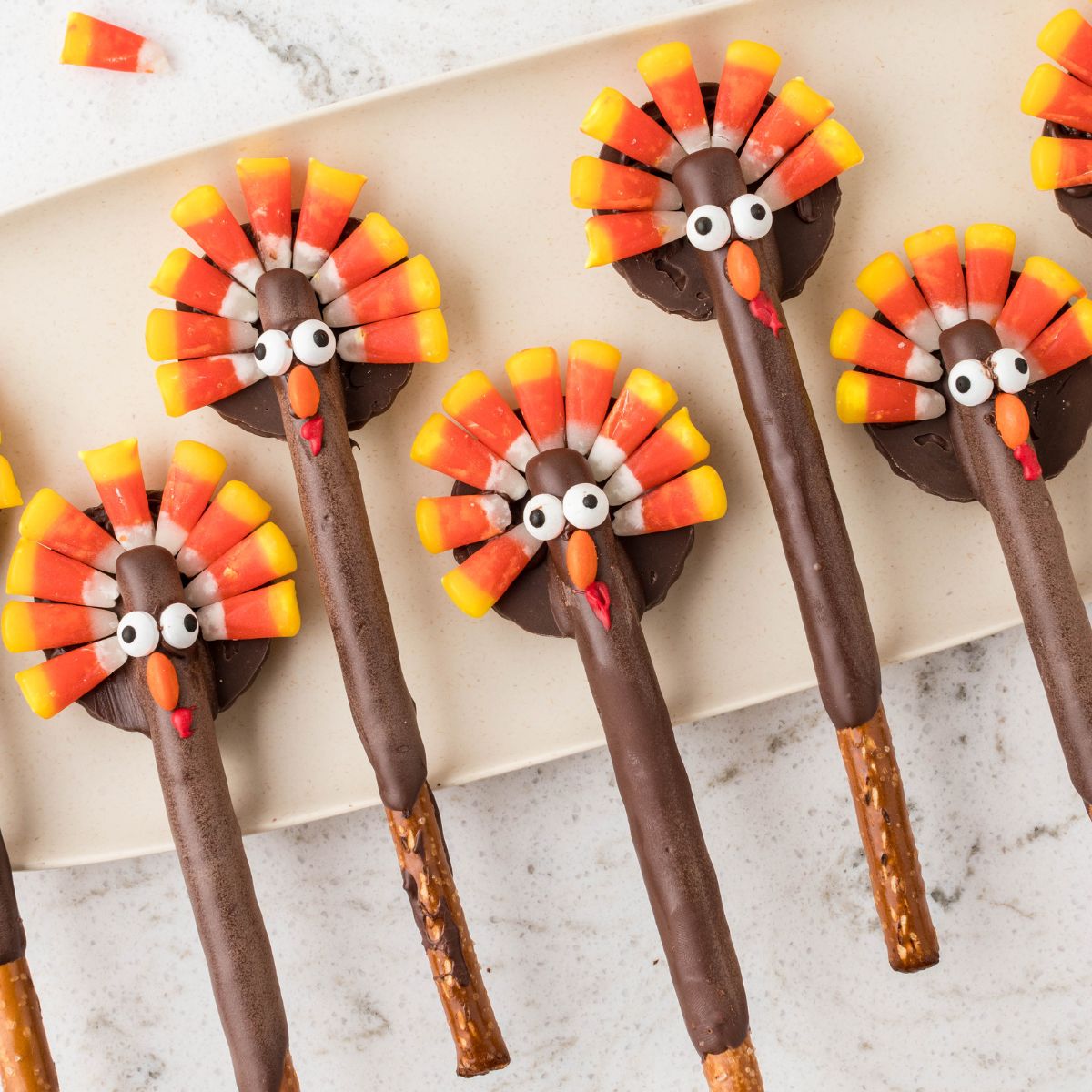 Learn how to make cute turkey pretzels with chocolate and candy corn candy. These turkey pretzel rods are perfect to celebrate during the fall.