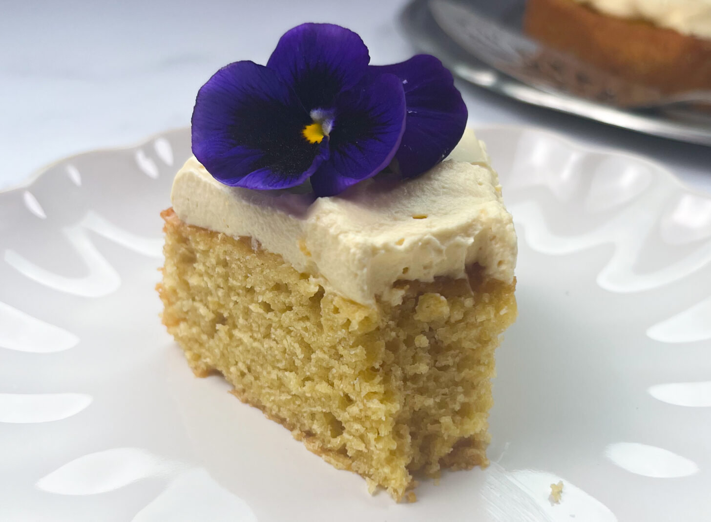✔️ Beautiful Presentation – The vibrant golden color of the cake, combined with the creamy frosting, makes for a stunning dessert that’s as pretty as it is delicious. I like to top cakes with pansies, because they’re so vibrant and edible! Here’s a guide to other edible flowers.